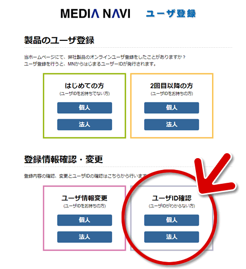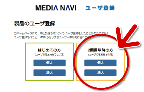 2製品目以降のユーザー登録の際は、「2回目以降の方(ユーザーIDをお持ちの方)」からご登録をお願いします。