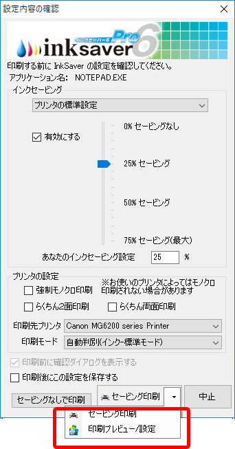 用紙の種類やフチなし設定などプリンタ独自の設定を利用しつつインクセービングする事ができます。