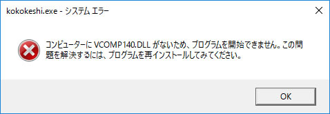 | Q1. 「コンピューターにVCOMP140.DLLがないため、プログラムを開始できません。この問題を解決するには、プログラムを再インストールしてみてください。」と表示され、起動できません。