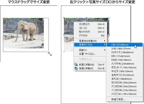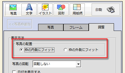 | Q10. 写真枠いっぱいに写真を表示することはできますか? A10. ![]() 調整タブの写真の配置の設定で写真の配置方法を変更することができます。 ![]() ![]() |