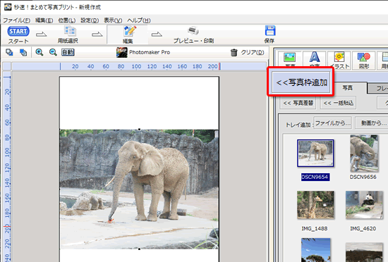 | Q4. 面付けの違うページを混在させることはできますか? A4. 1. 写真枠を追加するには、貼り込みたい写真を選択し「写真枠の追加」ボタンをクリックします。