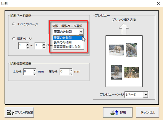 | Q9. 両面印刷対応のプリンタで自動両面印刷はできますか。 A9. 印刷画面で、「表面のみ印刷」「裏面のみ印刷」「表裏両面を順に印刷」を選択できます。 ![]() |