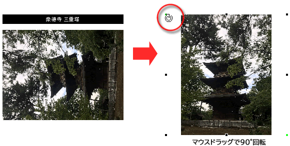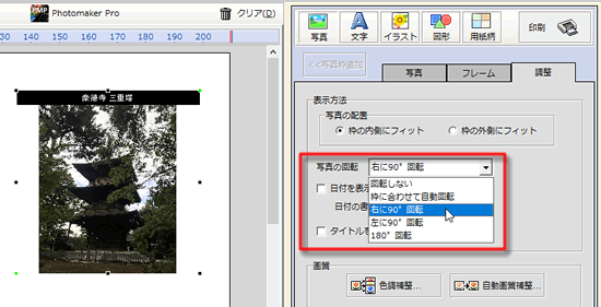 | Q8. タイトル付の写真を回転すると、タイトルが消えてしまいます。90°回転した画像にタイトルを付けることはできますか? A8. ![]() 写真を90度回転したい場合は、調整タブの写真の回転から「右に90°回転」「左に90°回転」を選択してください。 ![]() |