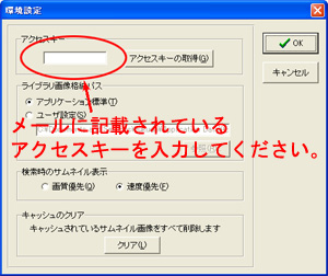 Q2. らくちんフォト検索を購入し、インストールしましたが、「アクセスキーが有効でありません。環境設定を開き、正しいアクセスキーを入力してください。アクセスキーの取得・確認、および有効期限の延長はこちらのページから行えます。」というメッセージが表示され、写真素材のダウンロードが出来ません。