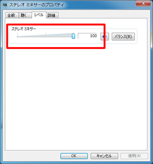 手順8. 【ステレオミキサー】をダブルクリックし、「レベル」タブを開き、消音になっていないか確認します。消音になっている場合は音量を上げ、【OK】ボタンをクリックします。