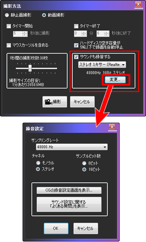 【変更】ボタンをクリックするとサンプリングレートやチャネル、サンプルビット数を設定できます。