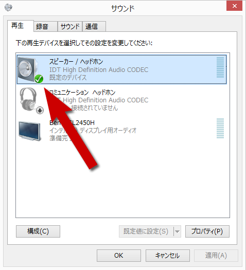 - 再生タブを選択します。PC内蔵の「スピーカー」 を選択し、既定のデバイスに変更して録音をお試しください。