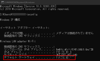 画面に従って合言葉を設定します。 - パソコンのコマンドプロンプトを起動し、ipconfigで接続している「デフォルトゲートウェイ」のIPアドレスを確認します。